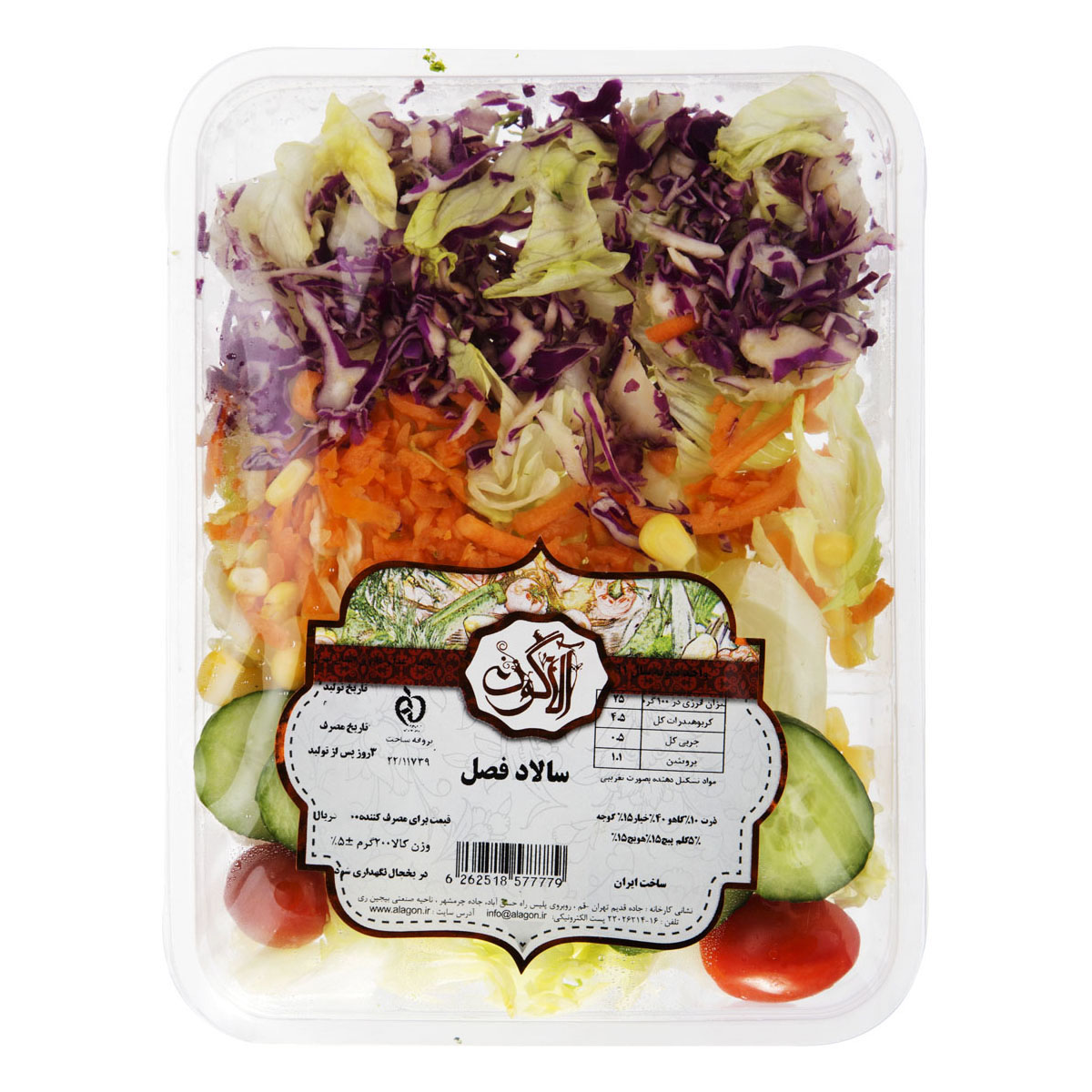 سالاد فصل آلاگون مقدار 200 گرم محتویات: ذرت، گوجه گیلاسی، خیار، کلم قرمز، هویج، کاهو