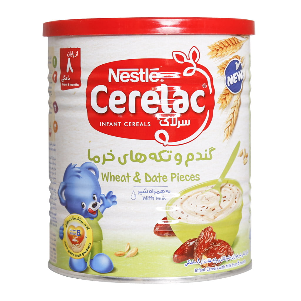 سرلاک گندم و تکههای خرما 400 گرمی نستله از پایان ۸ ماهگی قابل استفاده برای شیرخواران می باشد.