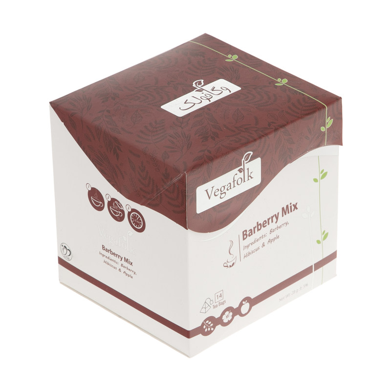 دمنوش مخلوط زرشک وگافولک بسته 14 عددی: وزن ۲۸ گرم وزن بسته‌بندی ۶۶ گرم ابعاد بسته‌بندی ۹.۲ × ۱۰ × ۱۰ سانتی‌متر شماره پروانه بهداشت ۳۸/۱۴۴۹۶ اجزای تشکیل‌دهنده - دمنوش مخلوط زرشک - ترکیبات : زرشک، چای ترش و سیب