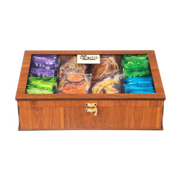 جعبه چوبی دمنوش و میوه خشک رازیان، گزینه ای مناسب جهت نظم دادن به چای های کیسه ای و هدیه ای خاص می باشد. این جعبه با بسته بندی شیک و شکیل، حاوی 4 خانه برای 5 نوع دمنوش و 2 خانه برای میوه خشک رازیان بوده و درب جعبه با طرحی زیبا و ظریف از نقوش اسلیمی تزیین شده است که آنرا از سایر جعبه ها متمایز می نماید. قفل و لولای به کار رفته درآن فلزی است. این جعبه به راحتی قابل حمل و جابه جایی است و فضای کمی از میز شما در منزل و یا اتاق کارتان را پر میکند. دمنوش های گیاهی رازیان رغوب ترین محصولات ارگانیک از دل طبیعت ، دنیایی از طعم ،مزه ، بو و خواص گیاهی و دارویی و میوه خشک تازه و باکیفیت در بسته بندی بهداشتی در جعبه پذیرایی چوبی مناسب ذائقه و سلیقه شما مصرف کننده عزیزتقدیم می گردد.
