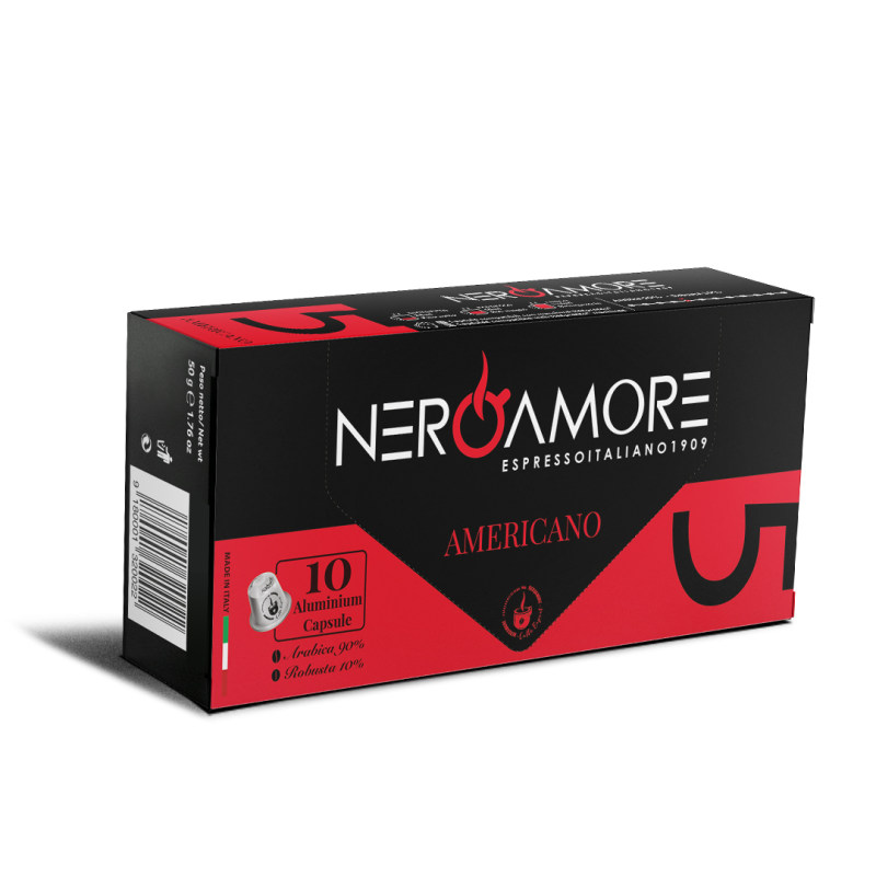 کپسول قهوه آمریکانو نروآمور بسته 10 عددی: کپسول آلومینیومی قهوه نروآمور مدل آمریکانو شماره 5 NEROAMORE Coffee capsules Americano با 90% عربیکا و 10% روبوستا است که قهوه ای عالی و دلچسب را برای شما به ارمغان می آورد.