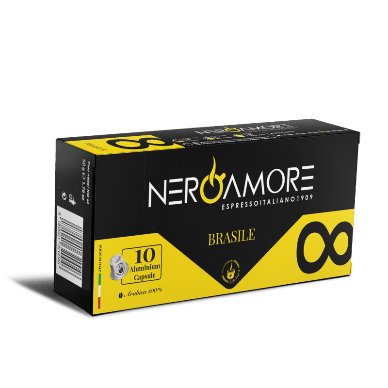 کپسول قهوه برزیل نروآمور بسته 10 عددی: کپسول آلومینیومی قهوه نروآمور مدل برزیل شماره 8 NEROAMORE Coffee capsules Brasile با 100% عربیکا است که قهوه ای عالی و دلچسب با کافئین بالاتر برای شما به ارمغان می آورد.