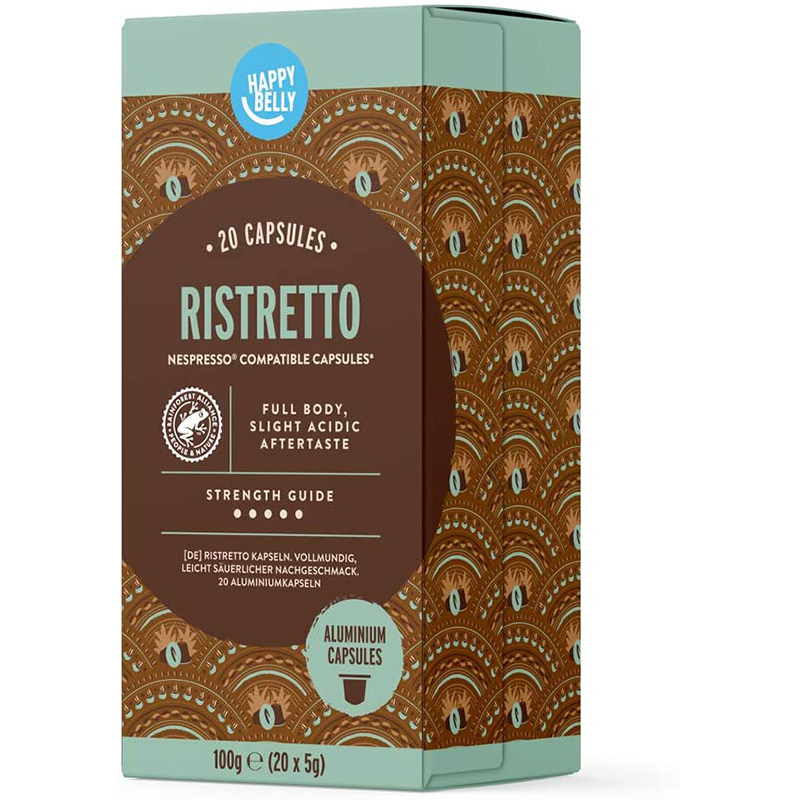 کپسول ریسترتو هپی بلی شامل 20 عدد کپسول قهوه می باشد. قهوه موجود در این محصول از مزارع دارای گواهی Rainforest Alliance می باشد. پوشش آلومینیوم به کپسول ها این امکان را می دهد که عطر بهینه و قهوه ای خوش طعم را تضمین کند. نت کاکائو، نت های تند و فلفلی و ماندگاری طولانی دارد. ترکیب این قهوه 85 درصد عربیکا- 15 درصد روبوستا بوده و قدرت 5 از 5 دارد و مناسب برای رژیم های گیاهخواری و وگان است. این کپسول قهوه ساخت بلژیک به سفارش آمازون می باشد.