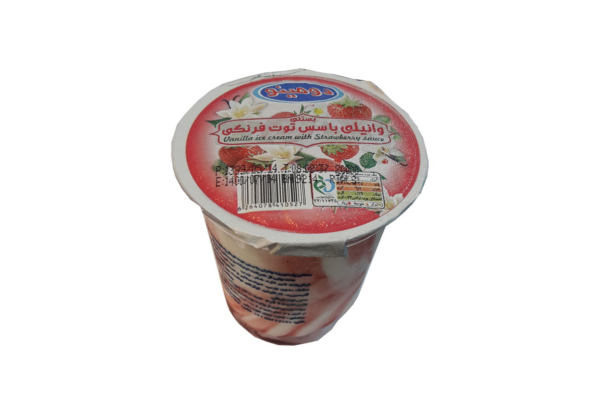 بستنی لیوانی وانیلی با سس توت فرنگی دومینو