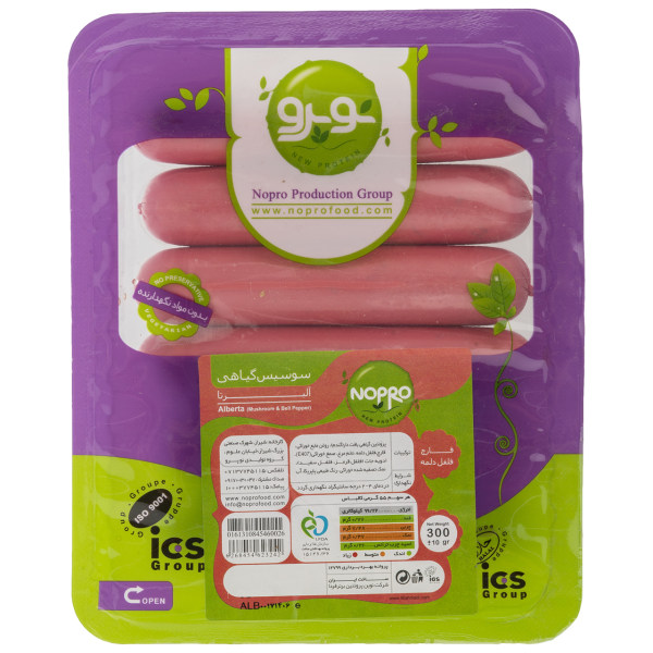 سوسیس گیاهی آلبرتا نوپرو 300 گرم ترکیبات: پروتئین گیاهی بافتدار (گندم)، روغن مایع خوراکی، قارچ، فلفل دلمه، تخم مرغ، صمغ خوراکی (E407)، ادویهجات (فلفل قرمز، فلفل سفید)، نمک تصفیه شده خوراکی، رنگ طبیعی پاپریکا، آب