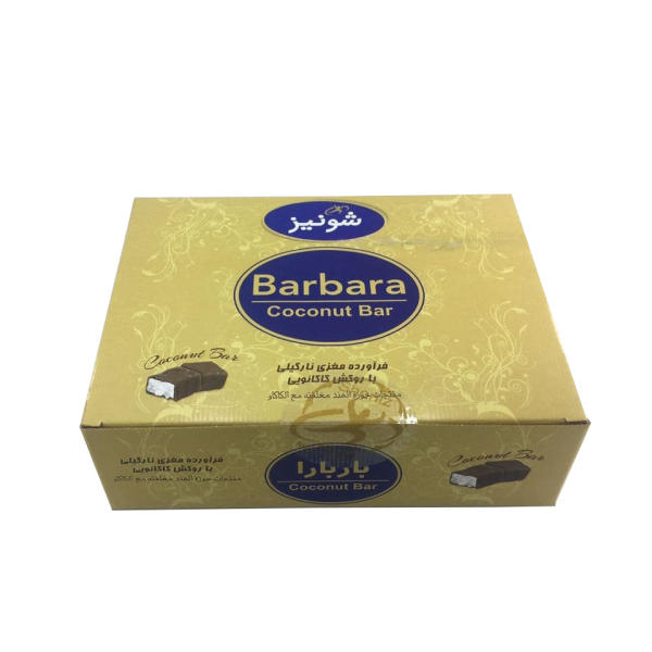 شکلات مغزدار نارگیلی باربارا تولید شده در شرکت شونیز محصول خوش طعم و با بسته بندی کاملا مناسب می باشد. این شکلات دارای یک روکش کاکائویی با مغز پودر نارگیل تازه می باشد.