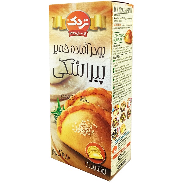 پودر آماده خمیر پیراشکی تردک - 480 گرم : کیفیت و ارشز غذایی بسیار خوب و قیمت مناسب ، ترکیبات: آرد گندم، خمیر مایه، نمک تصیفیه شده، شکر، بهبود دهنده نان، شیرخشک بدون چربی ، – فاقد اسیدهای چرب ترانس