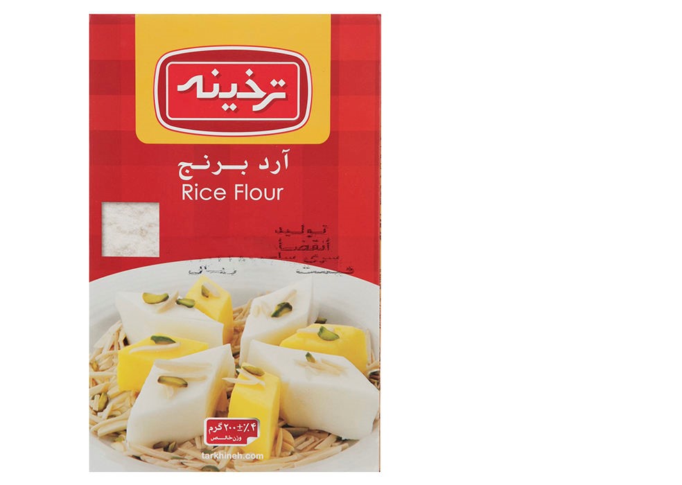 محصولی که میبینیم آرد برنج «ترخینه» است که در بستهبندی با ابعاد 16 × 10 × 3 سانتیمتر عرضه شده و حاوی 200 گرم آرد برنج است. از این محصول میتوان در تهیه انواع شیرینی، دسر، فرنی و حلوا استفاده کرد. آرد برنج میتواند فیبر مورد نیاز بدن انسان را تامین کند.