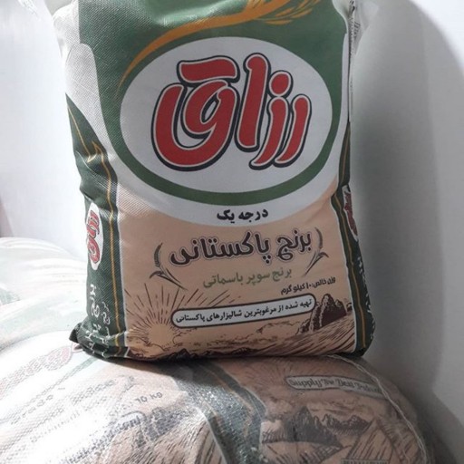 برنج پاکستانی رزاق 10 کیلو گرم برنج عالی و بو و طعم عالی و بسته بندی بسیار خوب این نوع برنج هم دارای مواد معدنی و ویتامین های بیشمار است ولی البته هضم آن کمی مشکل است وبهتر است که مخلوط با برنج سفید بکار برده شود .