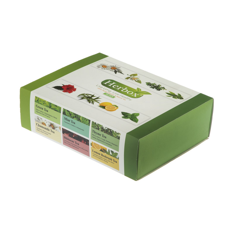 دمنوش کیسه ای هرباکس بسته 48 عددی: این دمنوش حاوی 6 طعم دمنوش با طعم های آویشن، چای سبز، چای ترش، بابونه، به لیمو و نعنا میباشد و از هرکدام 6 عدد درمجموع 48 عددی میباشد که 100 درصد طبیعی بدون اسانس و افزودنی میباشد.