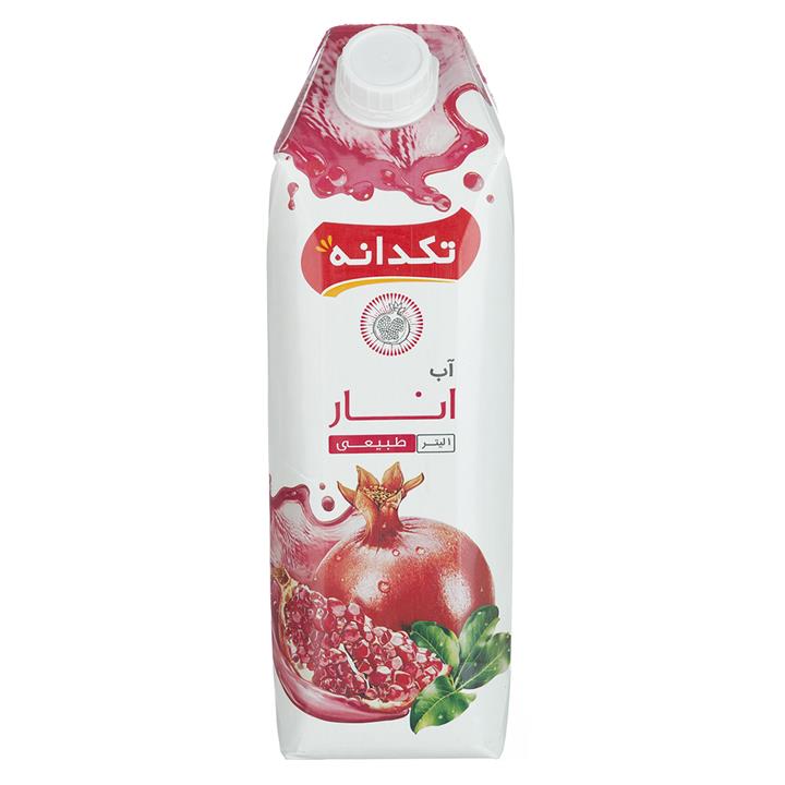 آب انار 1 لیتری تکدانه : کیفیت و طعم بسیار خوب آبمیوه 1 لیتر با طعم انار برند تکدانه طبیعی و بدون مواد نگهدارنده و رنگی و قیمت مناسب ، حاوی ویتامین ث و ترکیبات آنتی اکسیدانهای طبیعی